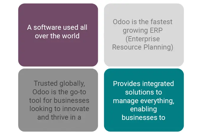 Odoo is an innovative and complete business management software that optimizes operations by integrating a comprehensive set of customizable applications to meet the diverse needs of any company.